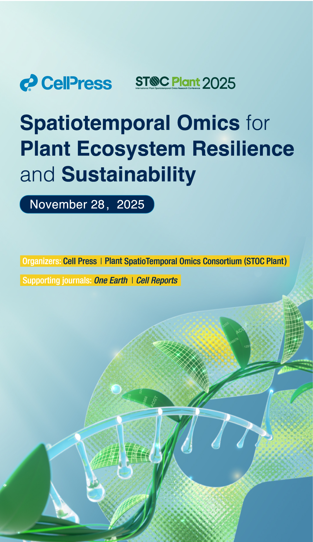 On Nov 28, 2025, Cell Press and STOC Plant will co-host a full-day workshop Spatiotemporal Omics for Plant Ecosystem Resilience and Sustainability, as a key session of the STOC Plant 2025. Anchored on two pivotal topics Mapping Plant Resilience, and Unlocking Plant Resilience, supported by Cell Press journals One Earth and Cell Reports, the workshop will feature 8 keynote talks and interactive panel discussions. Stay tuned for further updates.